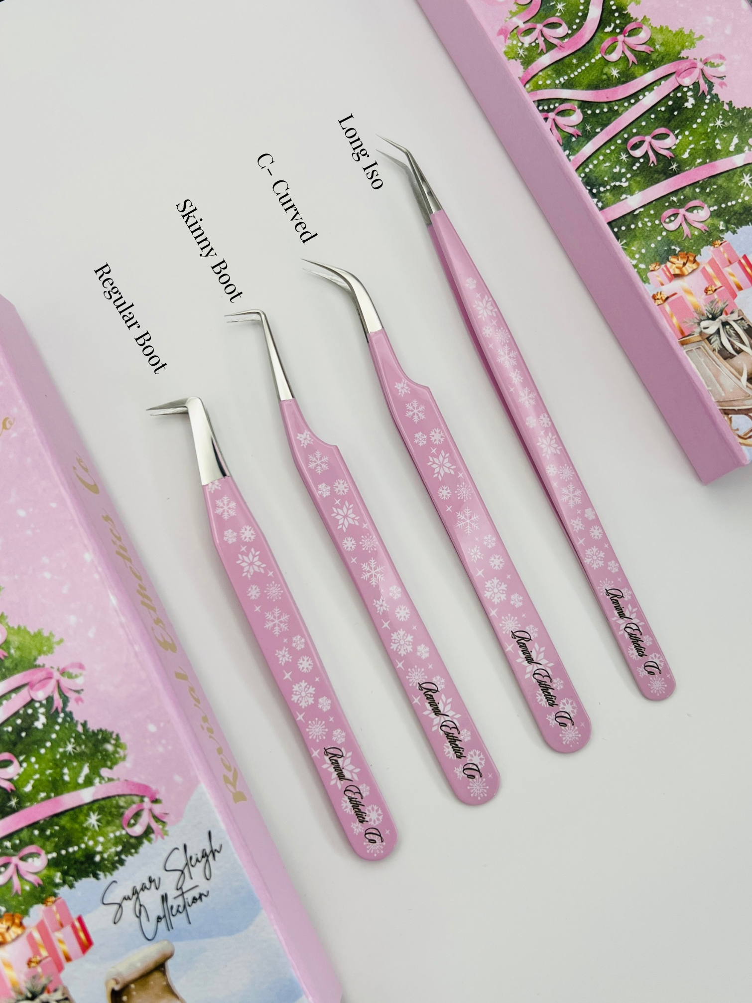 The Sugar Sleigh Collection was created for lash artists who love precision, performance, and a little holiday magic. Designed to feel soft, luxe, and powerful in your hand, each tweezer is hand-tested to deliver effortless pickup, clean isolation, and flawless fan control.